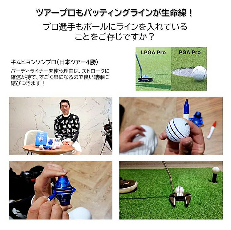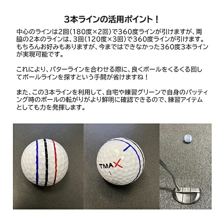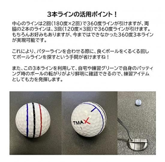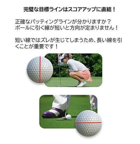 | 商品概要 | ゴルフボール に360°の線を簡単に引ける! 3本の線を引くことでライン目標が定めやすく、スコアアップに繋がる! 三色のペン付きで、理想の線が思うままに描ける |