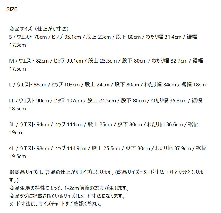 | サイズ(仕上がり寸法) | M / ウエスト 82cm / ヒップ 99.1cm / 股上 23.5cm / 股下 80cm / わたり幅 32.7cm / 裾幅 17.5cm L / ウエスト 86cm / ヒップ 103cm / 股上 24cm / 股下 80cm / わたり幅 34cm / 裾幅 18cm LL / ウエスト 90cm / ヒップ 107cm / 股上 24.5cm / 股下 80cm / わたり幅 35.3cm / 裾幅 18.5cm |