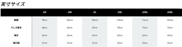 | 実寸サイズ(cm) | M:胸囲103、後ろ着丈69、袖丈62、袖口幅21 L:胸囲105、後ろ着丈69、袖丈62、袖口幅21 XL:胸囲110、後ろ着丈70、袖丈62、袖口幅22 |