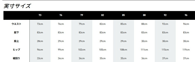 | 実寸サイズ(cm) | 79:股下83cm、股上29cm、ヒップ102cm、裾回り34cm 82:股下83cm、股上29cm、ヒップ105cm、裾回り35cm 85:股下83cm、股上29cm、ヒップ108cm、裾回り35cm 88:股下83cm、股上30cm、ヒップ111cm、裾回り36cm |