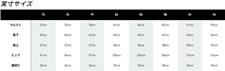 | 実寸サイズ(cm) | 79:股下69cm、股上27cm、ヒップ97cm、裾回り36cm 82:股下69cm、股上28cm、ヒップ100cm、裾回り37cm 85:股下69cm、股上28cm、ヒップ103cm、裾回り37cm 88:股下69cm、股上28cm、ヒップ106cm、裾回り38cm |
