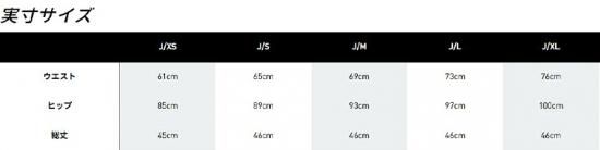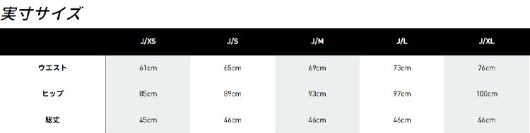 | 実寸サイズ(cm) | S:ウエスト65cm、ヒップ89cm、総丈46cm M:ウエスト69cm、ヒップ93cm、総丈46cm L:ウエスト73cm、ヒップ97cm、総丈46cm |