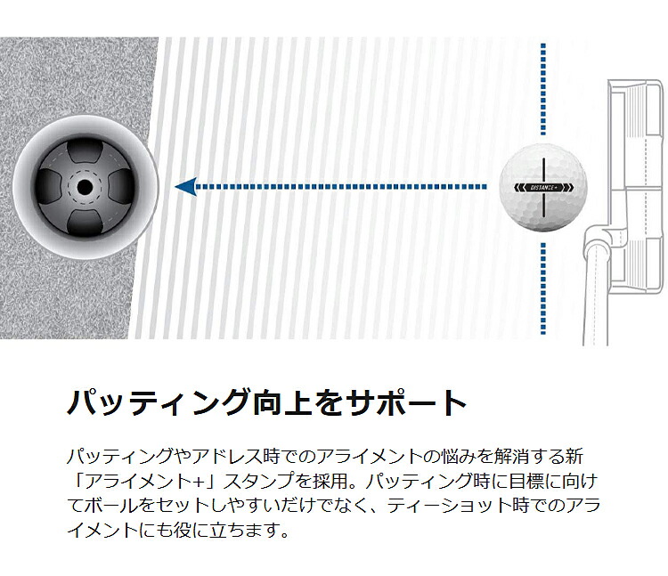 パッティングやアドレス時でのアライメントの悩みを解消する新「アライメント+」スタンプを採用。パッティング時に目標に向けてボールをセットしやすいだけでなく、ティーショット時でのアライメントにも役に立ちます。