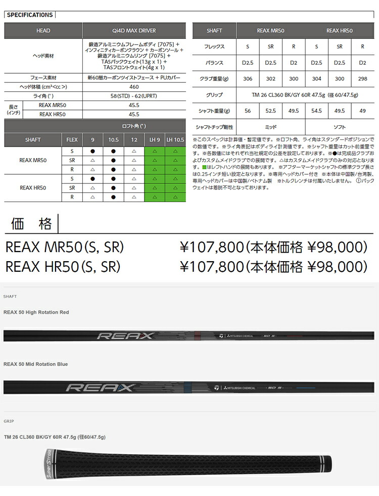 | シャフト | REAX 50 Mid R Blue | REAX 50 High R Red |