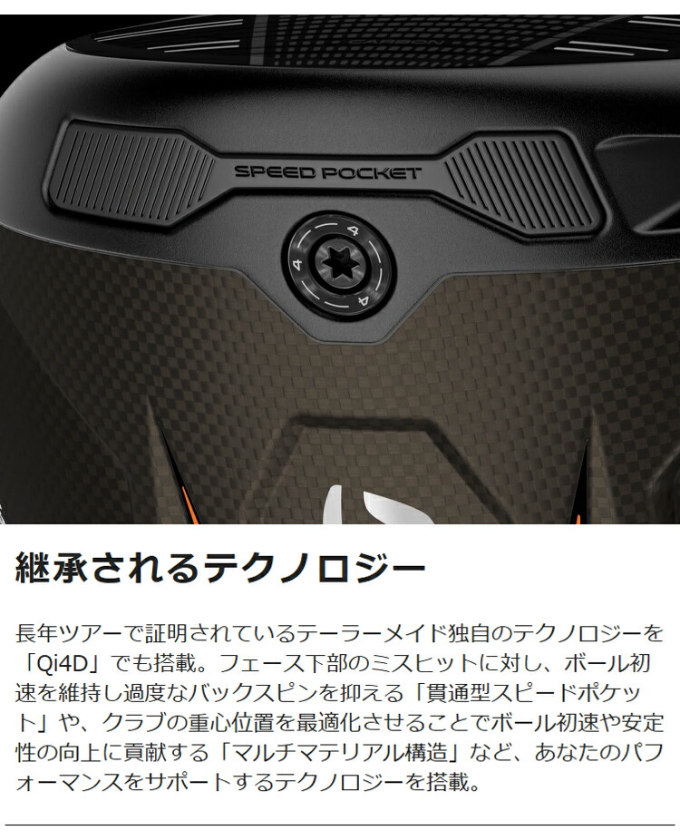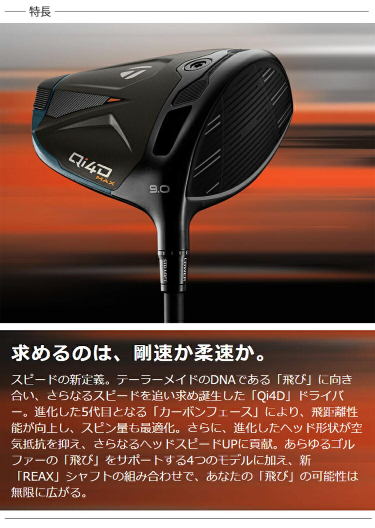 スピードの新定義。テーラーメイドのDNAである「飛び」に向き合い、さらなるスピードを追い求め誕生した「Qi4D」ドライバー。進化した5代目となる「カーボンフェース」により、飛距離性能が向上し、スピン量も最適化。さらに、進化したヘッド形状が空気抵抗を抑え、さらなるへッドスピードUPに貢献。あらゆるゴルファーの「飛び」をサポートする4つのモデルに加え、新「REAX」シャフトの組み合わせで、あなたの「飛び」の可能性は無限に広がる。