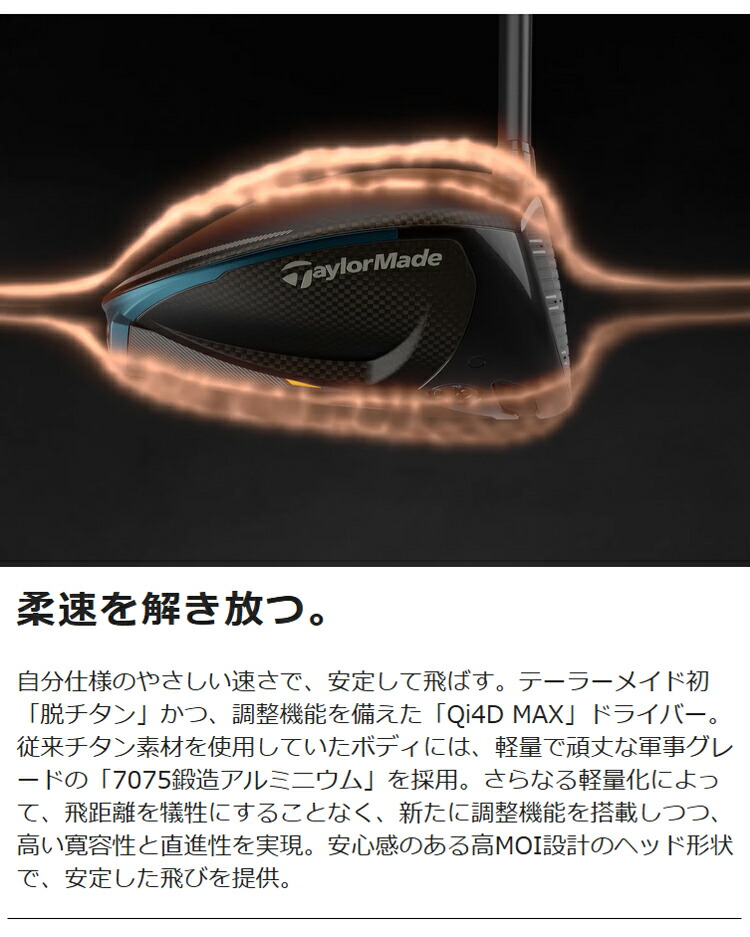 自分仕様のやさしい速さで、安定して飛ばす。テーラーメイド初「脱チタン」かつ、調整機能を備えた「Qi4D MAX」ドライバー。従来チタン素材を使用していたボディには、軽量で頑丈な軍事グレードの「7075鍛造アルミニウム」を採用。さらなる軽量化によって、飛距離を犠牲にすることなく、新たに調整機能を搭載しつつ、高い寛容性と直進性を実現。安心感のある高MOI設計のヘッド形状で、安定した飛びを提供。