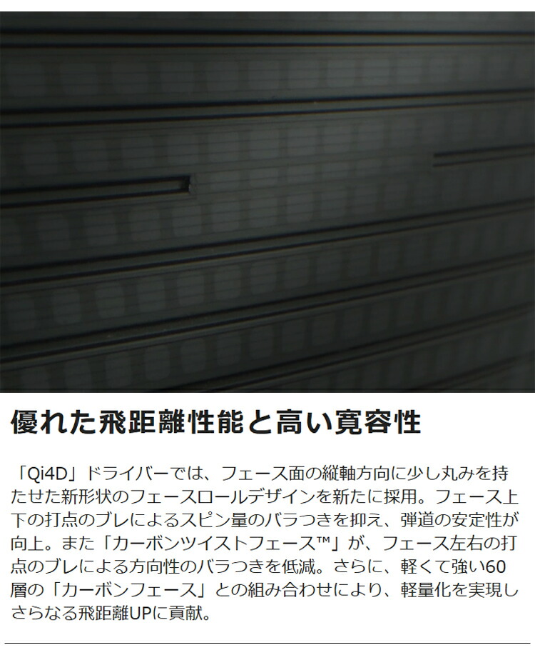 「Qi4D」ドライバーでは、フェース面の縦軸方向に少し丸みを持たせた新形状のフェースロールデザインを新たに採用。フェース上下の打点のブレによるスピン量のバラつきを抑え、弾道の安定性が向上。また「カーボンツイストフェース」が、フェース左右の打点のブレによる方向性のバラつきを低減。