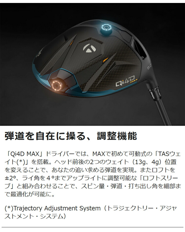 「Qi4D MAX」ドライバーでは、MAXで初めて可動式の「TASウェイト」を搭載。ヘッド前後の2つのウェイト(13g、4g)位置を変えることで、あなたの追い求める弾道を実現。またロフトを±2°、ライ角を4°までアップライトに調整可能な「ロフトスリーブ」と組み合わせることで、スピン量・弾道・打ち出し角を細部まで最適化が可能に。