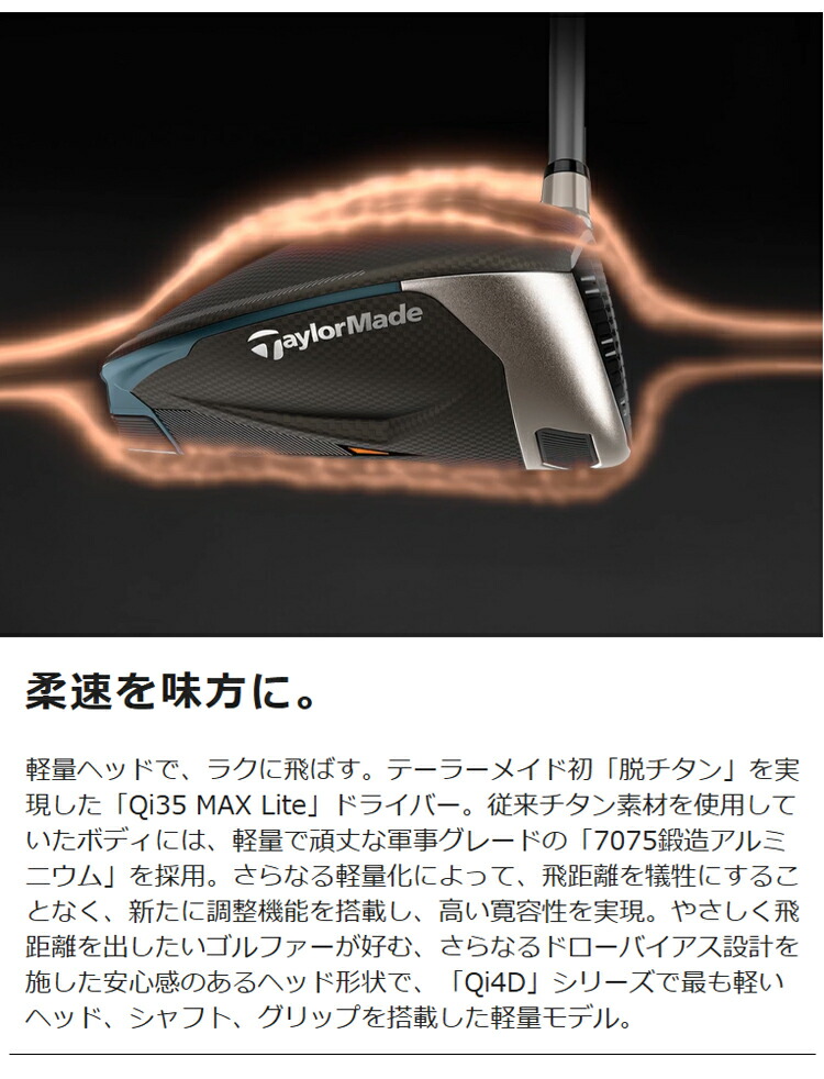 自分仕様のやさしい速さで、安定して飛ばす。テーラーメイド初「脱チタン」かつ、調整機能を備えた「Qi4D MAX」ドライバー。従来チタン素材を使用していたボディには、軽量で頑丈な軍事グレードの「7075鍛造アルミニウム」を採用。さらなる軽量化によって、飛距離を犠牲にすることなく、新たに調整機能を搭載しつつ、高い寛容性と直進性を実現。安心感のある高MOI設計のヘッド形状で、安定した飛びを提供。