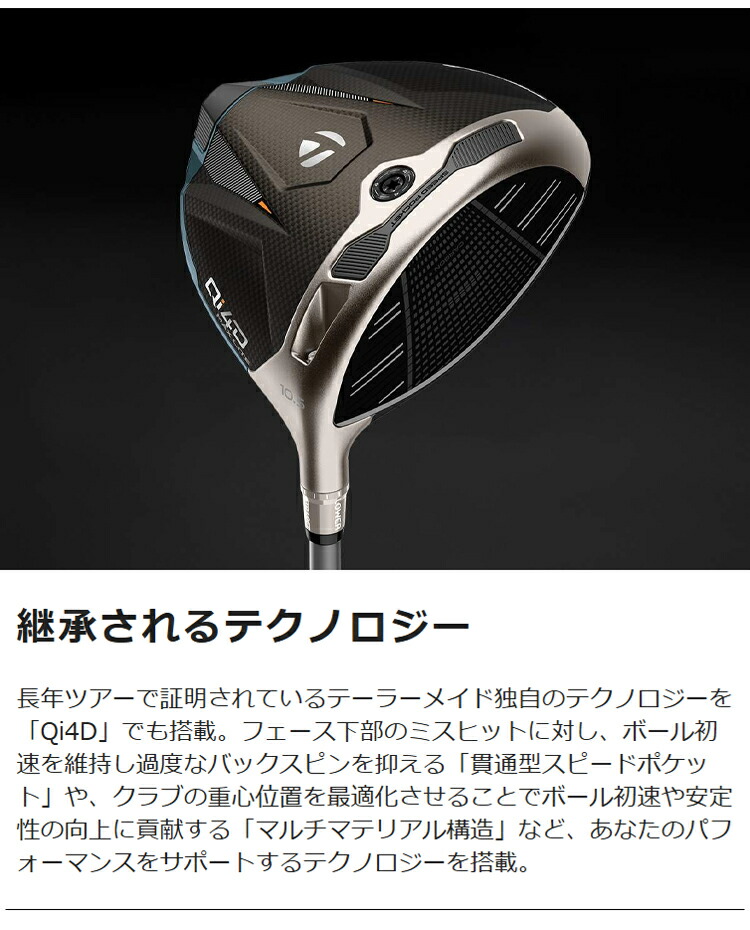 スピードの新定義。テーラーメイドのDNAである「飛び」に向き合い、さらなるスピードを追い求め誕生した「Qi4D」ドライバー。進化した5代目となる「カーボンフェース」により、飛距離性能が向上し、スピン量も最適化。さらに、進化したヘッド形状が空気抵抗を抑え、さらなるへッドスピードUPに貢献。あらゆるゴルファーの「飛び」をサポートする4つのモデルに加え、新「REAX」シャフトの組み合わせで、あなたの「飛び」の可能性は無限に広がる。