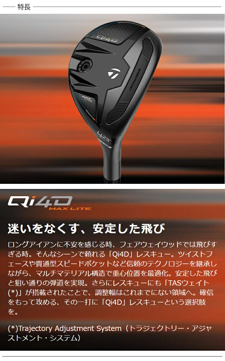 ロングアイアンに不安を感じる時、フェアウェイウッドでは飛びすぎる時。そんなシーンで頼れる「Qi4D」レスキュー。ツイストフェースや貫通型スピードポケットなど信頼のテクノロジーを継承しながら、マルチマテリアル構造で重心位置を最適化。安定した飛びと狙い通りの弾道を実現。さらにレスキューにも「TASウェイト」が搭載されたことで、調整幅はこれまでにない領域へ。確信をもって攻める、その一打に「Qi4D」レスキューという選択肢を。Trajectory Adjustment System(トラジェクトリー・アジャストメント・システム)