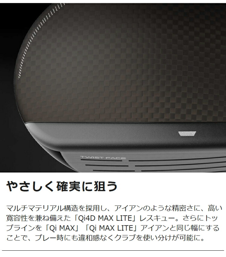 450ステンレススチールとより軽量化された「カーボンクラウン」を融合した「Qi4D」レスキュー。シャフトを0.5インチ短く設定することで、アイアンからのスムーズな流れを実現し、フェアウェイウッドとの飛距離の階段を最適化。さらにレスキューのトップラインを従来よりも細くしアイアンのトップラインに近づけることで、プレー時にも違和感なくクラブを使い分けが可能に。