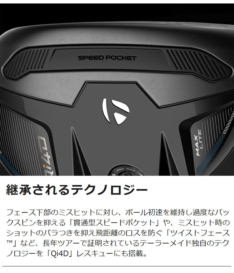 フェース下部のミスヒットに対し、ボール初速を維持し過度なバックスピンを抑える「貫通型スピードポケット」や、ミスヒット時のショットのバラつきを抑え飛距離のロスを防ぐ「ツイストフェース?」など、長年ツアーで証明されているテーラーメイド独自のテクノロジーを「Qi4D」レスキューにも搭載。