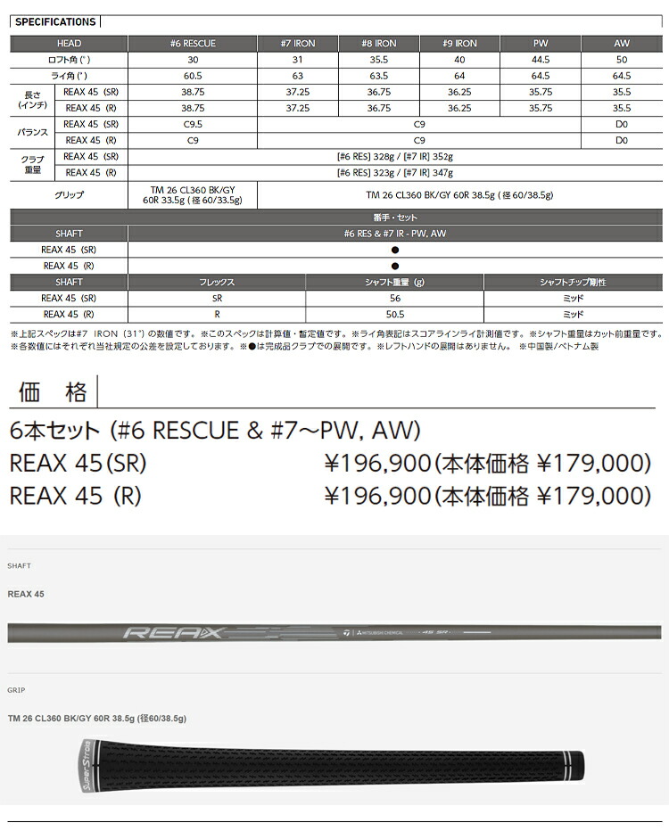 | クラブ重量(g) | REAX45/SR:[#6 RES] 328g / [#7 IR] 352g REAX45/R:[#6 RES] 323g / [#7 IR] 347g |