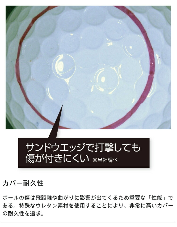 インナーカバーに無機充填剤を配合し、高比重にすることで、ボールの慣性モーメントが向上。 これにより、アイアンショットのスピン量が安定し、縦距離の安定性に貢献。さらに、パッティング時のボールの 転がりも向上し、最後のひと転がりまでゴルファーのパフォーマンスをサポート。