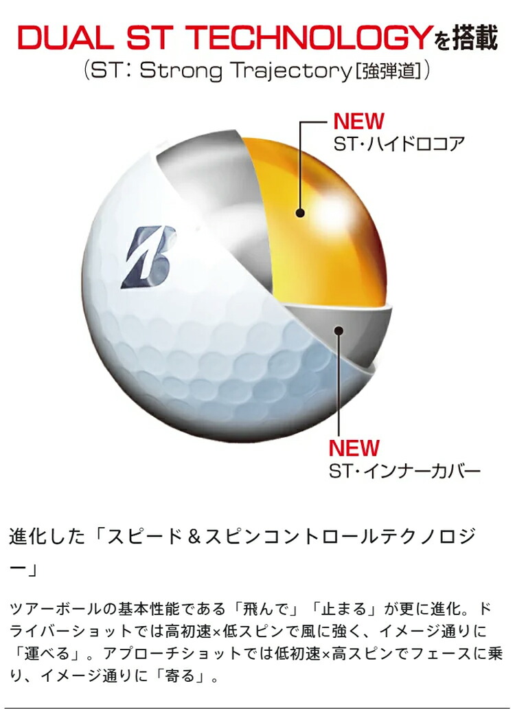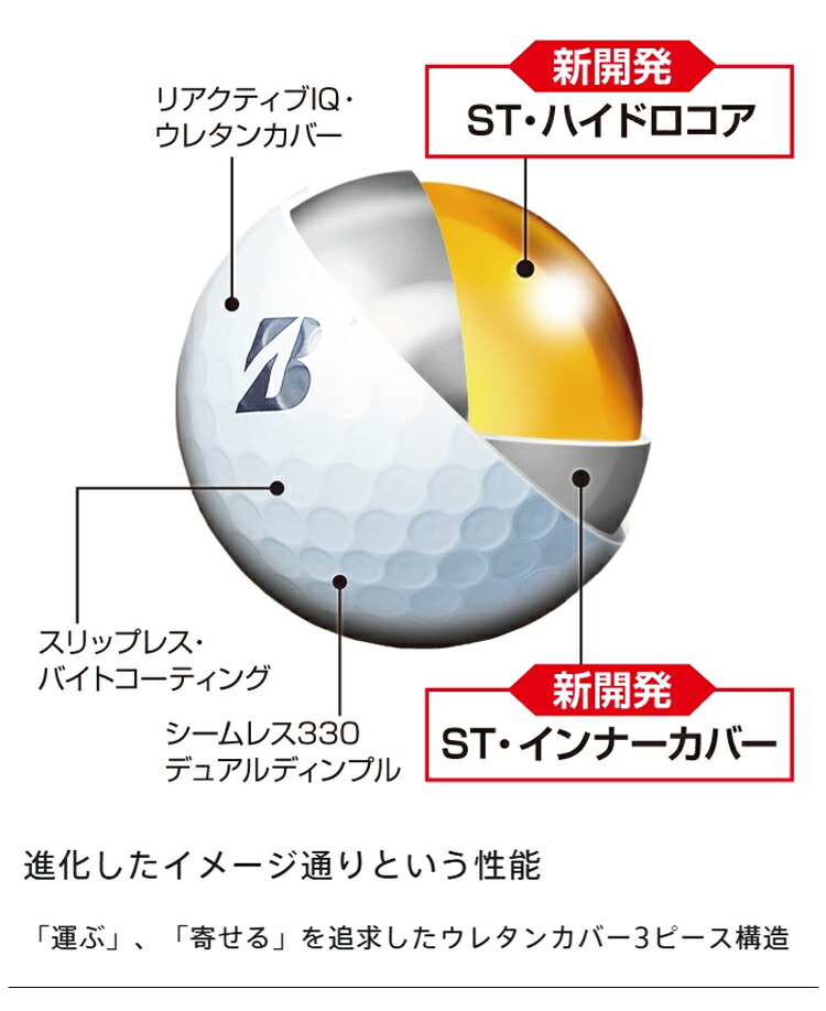 本モデルは、世界のトッププロが求める「飛んで、止まる」という性能をさらに磨き上げるために、設計思想の 核となる「スピード&スピン コントロールテクノロジー」により、フルショットでは「高初速×低スピン」、アプローチショット では「低初速×高スピン」を実現し、イメージ通りに“運べる・寄る”パフォーマンスを高次元で両立しています。 今回進化したのは、新薬品を配合した「ST・ハイドロコア」とブリヂストンゴルフ史上最も高剛性の「ST・インナー カバー」で、これらの相乗効果により、風に強く、狙ったラインへ安定して「運べる」強弾道を追求しています。また、 比重の高いインナーカバーがボール全体の慣性モーメント(MOI)を高めることで、空中でのスピン量が安定し、 飛距離と弾道の安定性を高めるとともに、グリーン上でのパッティング時の転がりの良さも追求しています。 さらに、「リアクティブ iQ・ウレタンカバー」と「スリップレス・バイトコーティング」を継続採用することで、タイガー・ウッズをはじめ、多くのプロが認めるアプローチショットでのフェースへの“乗り感”と“ディープ感”でイメージ通りに「寄る」性能を 追求しています。加えて、カバーの傷がつきにくく耐久性が高い点も、契約プロから高い評価を得ています。 飛距離に優れた「X」と、スピン性能に秀でた「XS」。どちらの「B」も世界のツアーレベルの選択肢としてゴルファーの 最高のパフォーマンスをサポートします。