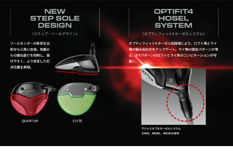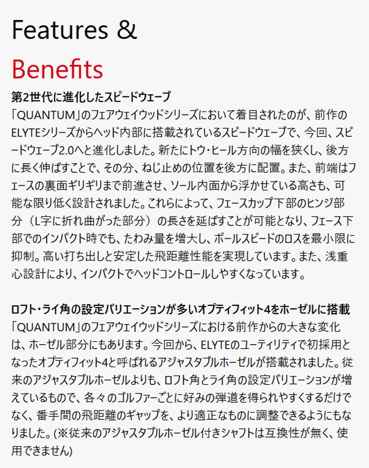 「QUANTUM」のフェアウェイウッドシリーズにおける前作からの大きな変化は、ホーゼル部分にもあります。今回から、ELYTEのユーティリティで初採用となったオプティフィット4と呼ばれるアジャスタブルホーゼルが搭載されました。従来のアジャスタブルホーゼルよりも、ロフト角とライ角の設定バリエーションが増えているもので、各々のゴルファーごとに好みの弾道を得られやすくするだけでなく、番手間の飛距離のギャップを、より適正なものに調整できるようにもなりました。(※従来のアジャスタブルホーゼル付きシャフトは互換性が無く、使用できません)