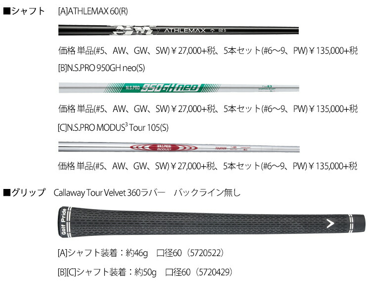 | メーカー希望小売価格 | 5本セット(#6〜9,PW)¥148,500 (本体価格 ¥135,000) 単品 (#5,AW,GW,SW)¥29,700 (本体価格 ¥27,000) |